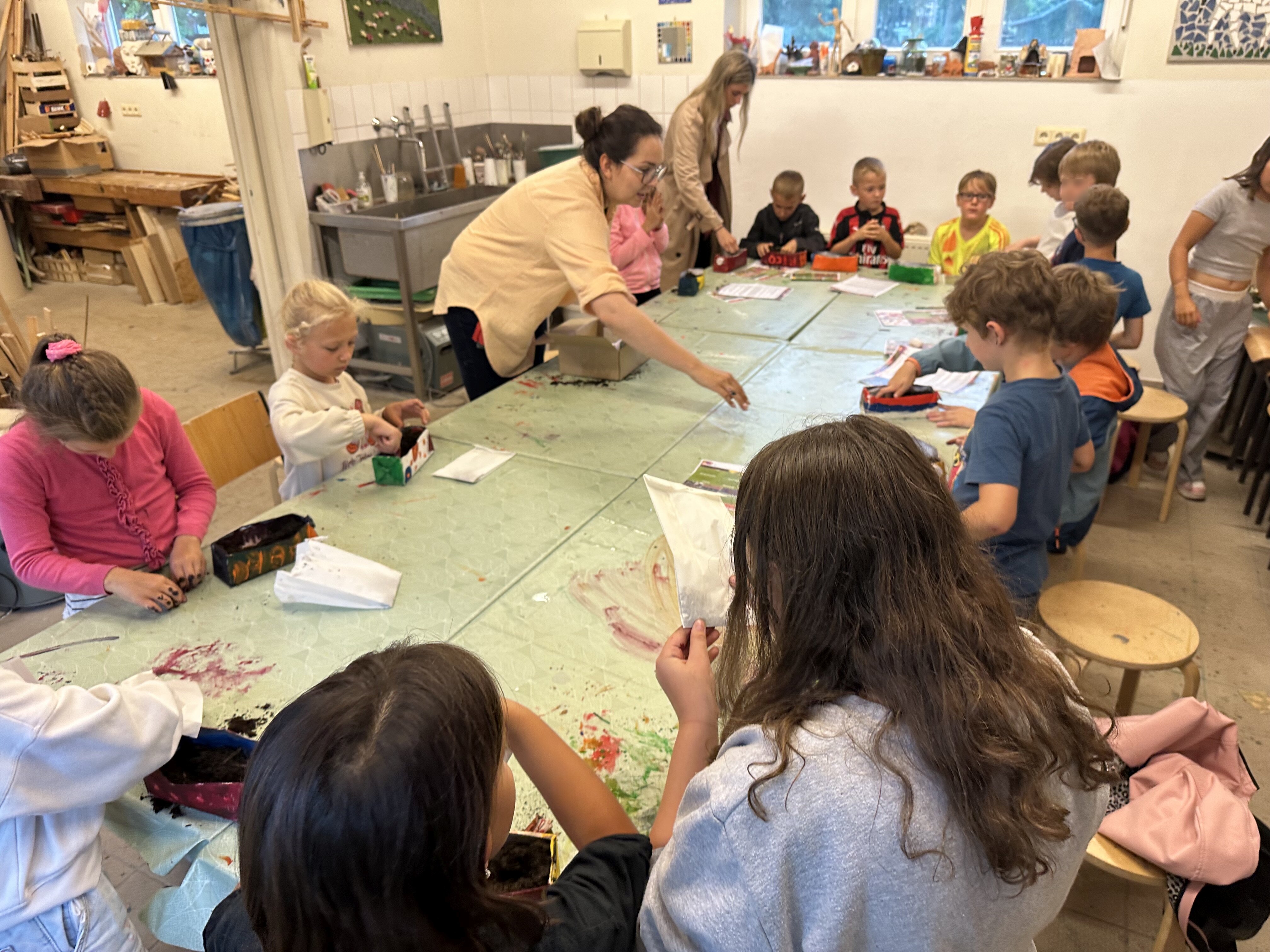 Mit Acrylfarben bemalen die Kinder schließlich aufgeschnittene Milchkartons. Mit etwas Erde und Blumensaat entstehen aus dem vermeintlichen Abfall ein paar Blumentöpfe. So lernen die Kleinen auch etwas über das Thema Upcycling und den sinnvollen Umgang mit Ressourcen. Ein kurzer Film über den menschengemachten Klimawandel und ein dazugehöriger Austausch runden das Programm ab.