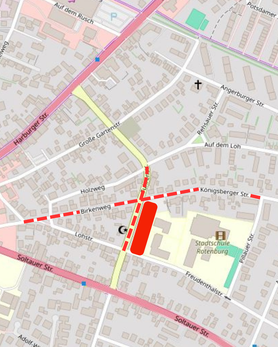 Das betrifft die Fuhrenstraße (auf Höhe der Lohstraße bis zum Holzweg), den Birkenweg (von der Kleinen Gartenstraße aus bis zur Fuhrenstraße) und die Königsberger Straße (von der Fuhrenstraße bis vor die Einmündung zur Pillauer Straße).